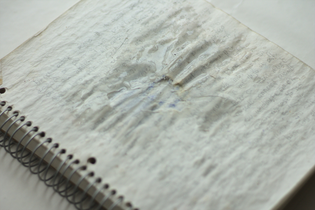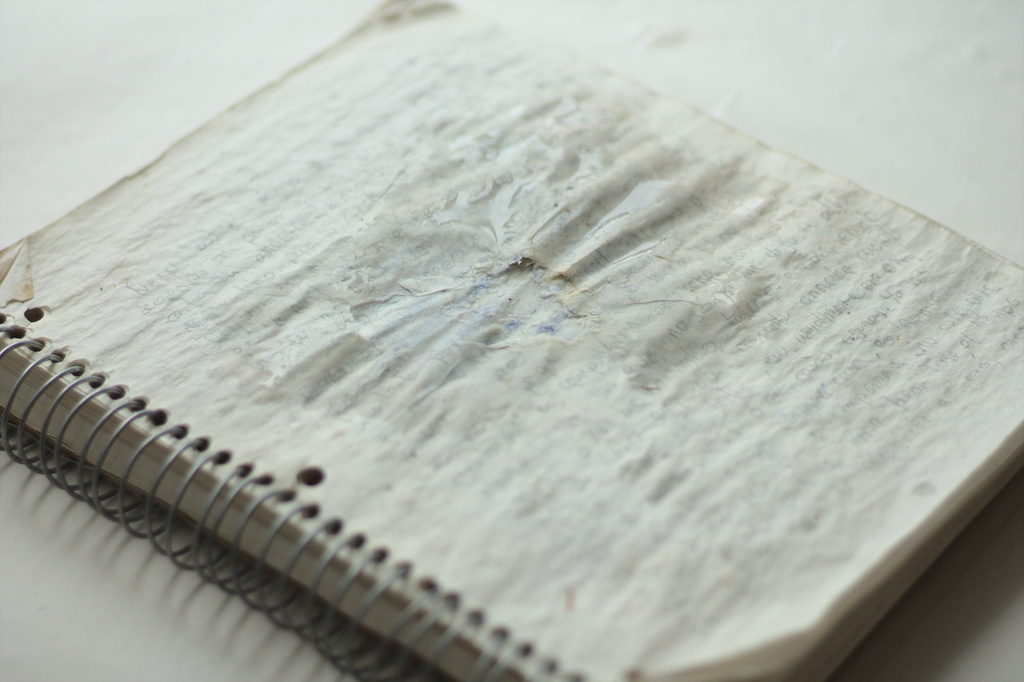Junto con el inicio de la pandemia empecé a escribir un diario personal. El cuaderno terminó por convertirse en contenedor cuando lo puse bajo una gotera en mi habitación. El proceso consistía en: recoger el cuaderno del piso, debajo de la gotera, escribir dos planas sobre lo que sea que aconteciera, devolver el cuaderno debajo de la gotera, repetir esto cada día.